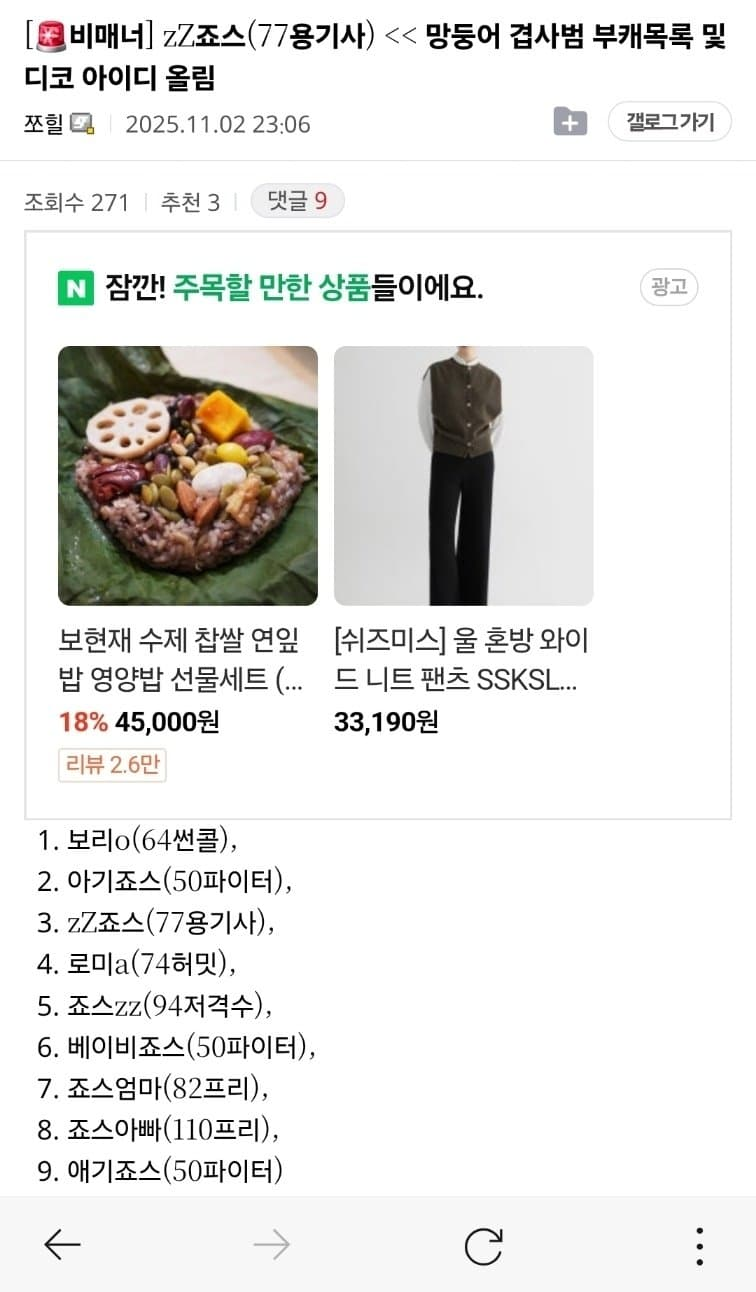 혐사 컬업 < 택배 반송 메랜지지 악질 개당 가격에 00 더 붙여서 맨 위에 뜨게 하는 거 열받아서 그대로 보냈더니 이러네 채널은 바꾸면서 메랜지지는 수정 안 하고 아직도 올려놔서 박제한다 나 이전에도 누가 똑같은 짓 했는지 메랜지지엔 이미 신고돼있네 제보자 : 메붕이 비매너 유저 : 컬업 작성날짜 : 25-11-04 19:02 1 1