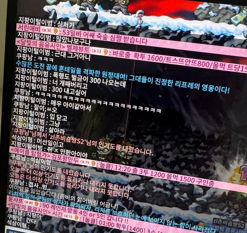 비매너 죽숲 욕설및 겸사범(쿠팡남,지팡이털이범) 닉:쿠팡남,지팡이털이범 상황: 죽숲3 채널돌다 아무도 없길래 사냥시작중 쿠팡남이 오더니 리치 때문에 강제로 맵나가진거라고 본인한테 나가라 주장 리치때문에 나가진건 자기사정이지 내상관 아니라고 했더니 그 뒤로 겹사하면서 지인부르고 겹사이어나가다 반응 안… 제보자 : 메붕이 비매너 유저 : 쿠팡남 외 1명 작성날짜 : 25-11-17 08:41 0 0